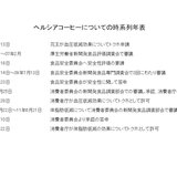 ヘルシアコーヒーの時系列年表。最初は血圧低減効果で許可。その後体脂肪低減効果で再度許可されている。